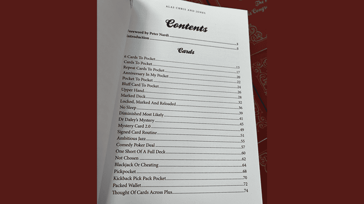 Alas Chris & Jones est le fruit de leur travail exceptionnel des 20 dernières années. Il contient 72 routines soigneusement sélectionnées parmi leurs ouvrages précédents, ainsi que 16 tours inédits. Vous y trouverez également des essais sur la magie rapprochée et la diversion.