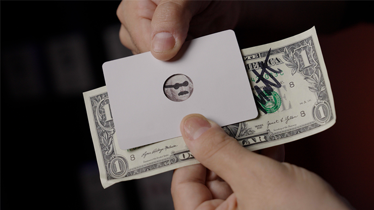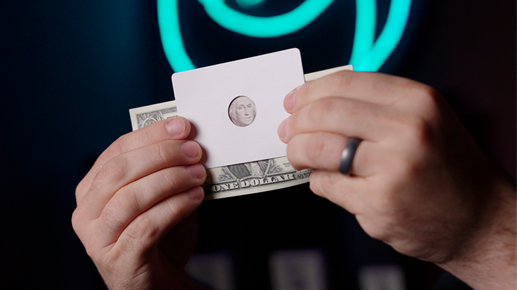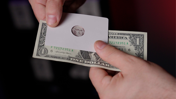 Une carte est montrée recto verso ; elle présente un grand trou au centre. On emprunte un billet, par exemple un dollar (ce tour fonctionne aussi bien avec les dollars qu’avec les livres sterling et les euros). La carte trouée est placée sur le billet, révélant le visage de George Washington. Sans aucun mouvement, faites glisser la tête de George Washington vers le haut du billet, puis vers la droite et enfin vers la gauche. Enfin, replacez sa tête sur ses épaules. Rendez immédiatement le billet emprunté et montrez la carte recto verso. Ce gimmick est fabriqué sur mesure et existe en versions 1 $, 5 £ et 10 €. Instructions en ligne détaillées et idées de bonus disponibles.