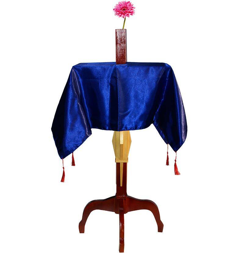 Le magicien s’approche d’une table élégante posée sur scène, recouverte d’un foulard.