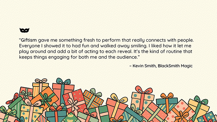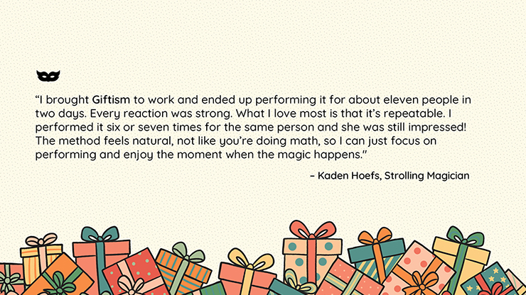 « Ce que j’aime avec Giftism, c’est que tout a une signification. Chaque élément a son utilité, et la méthode s’efface car on est complètement absorbé par le plaisir. C’est un tour efficace et rapide à remettre en place, ce qui est essentiel lorsqu’on enchaîne les prestations soir après soir. Je l’ai joué pour des personnes de tous âges, « Tout le monde adore. Ça les captive vraiment. » – Lewis Chaney, Magicien des Connexions Culturelles « Giftism m’a offert un numéro inédit qui crée un véritable lien avec le public. Tous ceux à qui je l’ai montré se sont amusés et sont repartis avec le sourire. J’ai aimé la liberté d’improviser et d’ajouter une touche théâtrale à chaque révélation. C’est le genre de numéro qui maintient l’intérêt du public et le mien. » – Kevin Smith, BlackSmith Magic « J’ai emmené Giftism au travail et j’ai fini par le présenter à une dizaine de personnes en deux jours. Chaque réaction a été forte. Ce que j’apprécie le plus, c’est sa reproductibilité. Je l’ai présenté six ou sept fois à la même personne et elle était toujours impressionnée ! La méthode est naturelle, pas comme faire des calculs, ce qui me permet de me concentrer sur la performance et de profiter pleinement du moment magique. » – Kaden Hoefs, Strolling Magicien