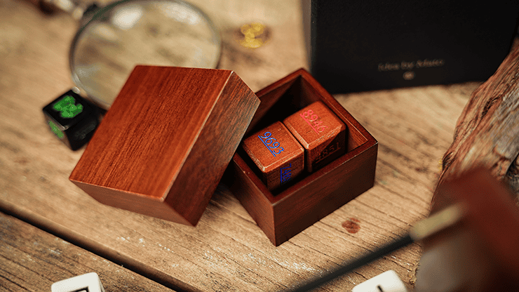 Numerology Dice comprend deux dés en bois — un rouge et un bleu — accompagnés d’une boîte en noyer avec couvercle et base.