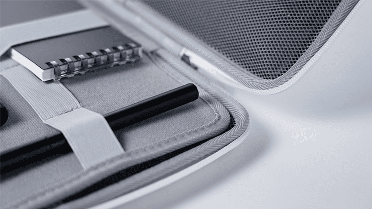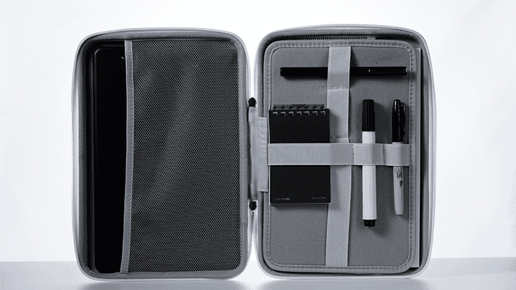Un côté est doté de sangles élastiques pour maintenir stylos, blocs-notes et autres petits objets, tandis que l’autre côté comprend une poche zippée pour les chargeurs et autres accessoires.