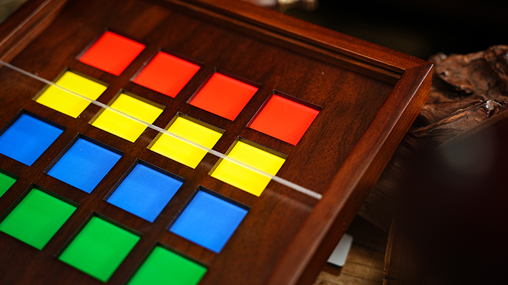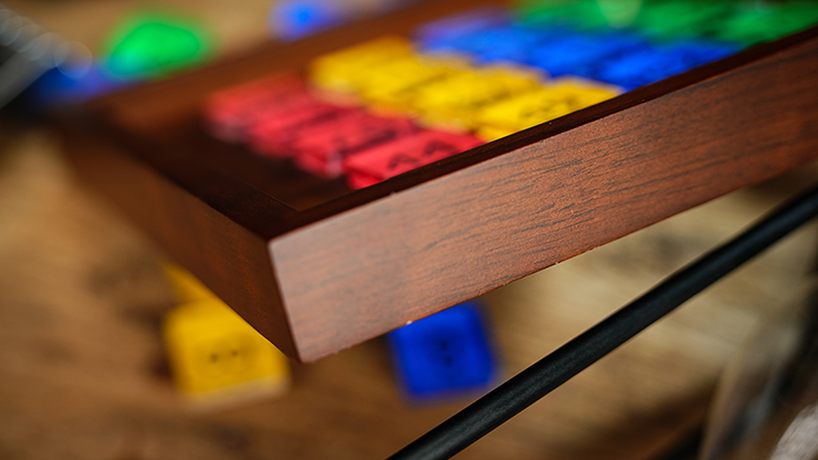 Le plateau en bois est équipé d’un couvercle en acrylique à verrouillage magnétique. Une fois les tuiles placées, le couvercle se met en place d’un clic, ce qui permet au performer d’incliner ou de tourner librement le plateau sans qu’aucune tuile ne bouge.